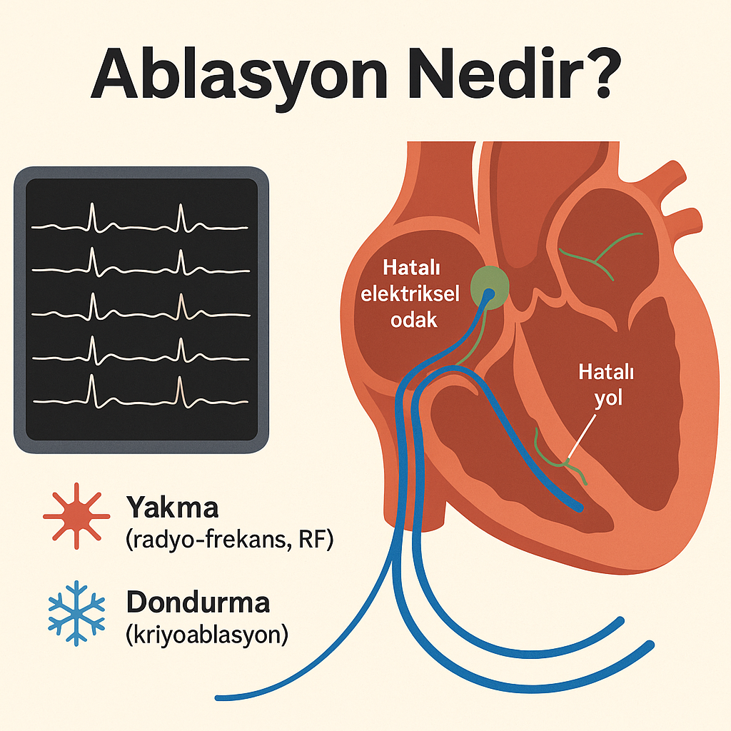 ablasyon nedir, kalpte ablasyon, çarpıntı tedavisi, RF ablasyon, kriyoablasyon, AVNRT ablasyon, WPW ablasyon, atriyal flutter ablasyon, AF ablasyon, pulmoner ven izolasyonu, ventriküler taşikardi ablasyon, EPS, elektrofizyoloji laboratuvarı, kasıktan giriş, 3D haritalama, İstanbul aritmi merkezi, kalp ritim bozukluğu tedavisi