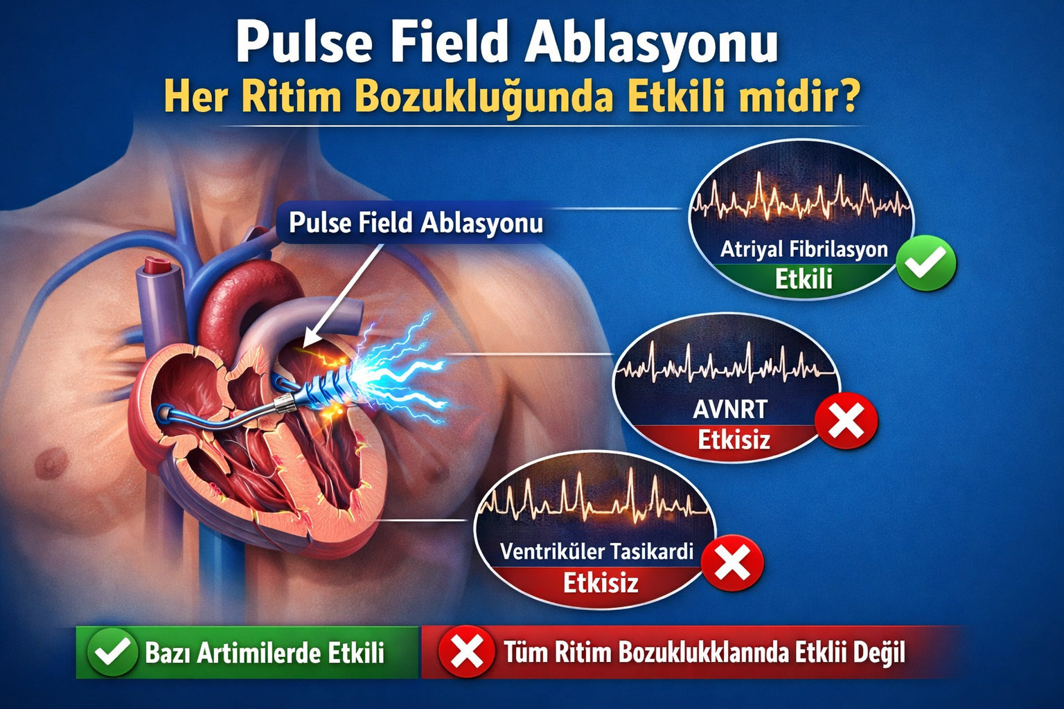Kateter ablasyonu, kalp ritim bozukluklarının tedavisinde günümüzde sık kullanılan ve oldukça etkili bir yöntemdir. Bu işlemde kalpte ritim bozukluğuna neden olan anormal elektriksel odaklar özel enerji yöntemleri kullanılarak ortadan kaldırılır. Özellikle bazı supraventriküler taşikardilerde ve belirli aritmi türlerinde ablasyon işlemi kalıcı tedavi sağlayabilir.