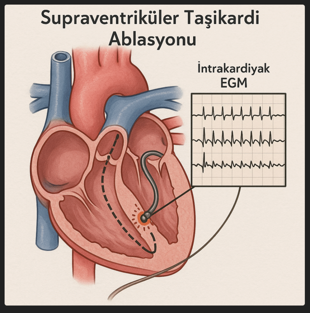 SVT ablasyonu, supraventriküler taşikardi tedavisi, SVT tedavisi, çarpıntı ablasyonu, kalp ritim bozukluğu tedavisi, kateter ablasyonu, radyofrekans ablasyon, kriyoablasyon, supraventriküler taşikardi nedir, çarpıntı nasıl geçer, SVT hasta bilgilendirme, elektrofizyoloji uzmanı, Prof. Dr. Serhan Özcan, İstanbul, ablasyon istanbul