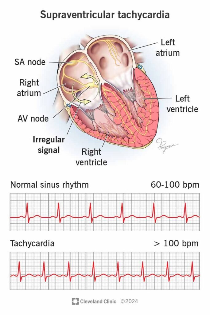Kalbin normal hızı dakikada 60–100 atım arasındadır. Ancak kalbin üst odacıklarında (atriyum) gelişen bazı anormal elektriksel devreler, kalbin ani şekilde çok hızlı atmasına sebep olabilir. Bu duruma supraventriküler taşikardi (SVT)denir.